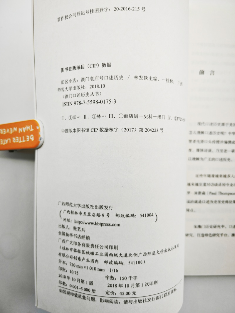 本书收录了位于澳门旧区“十月初五街”“烂鬼楼区”“营地大街”的十几家老店的访谈稿,有饼铺、零食店、饭店、花店、神香店、文具店、制衣店、糖水摊、修鞋摊等等。本书图文并茂,鲜活地展现了澳门旧区居民的生活场景,展现了这些老店的新旧面貌与生存压力,反映了澳门一个世纪以来的发展和变迁。书末附有店铺和叙述者名单、访谈日期和地点等“口述历史资料”,是难得的第一手资料。