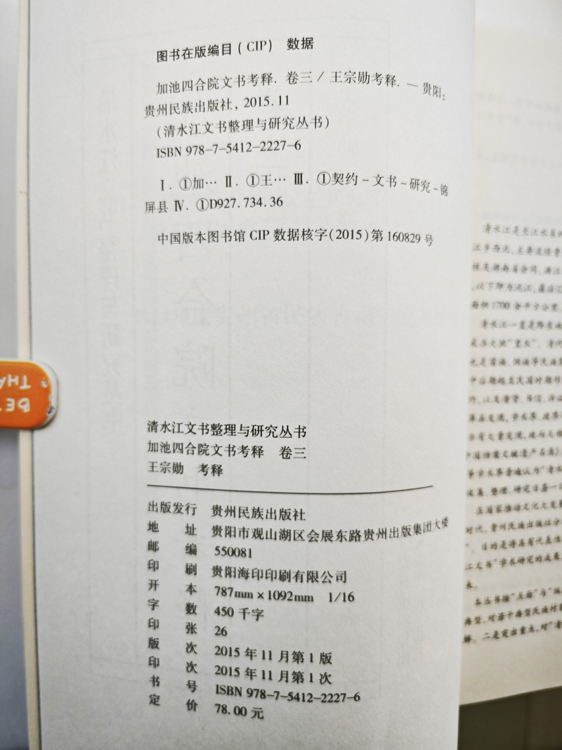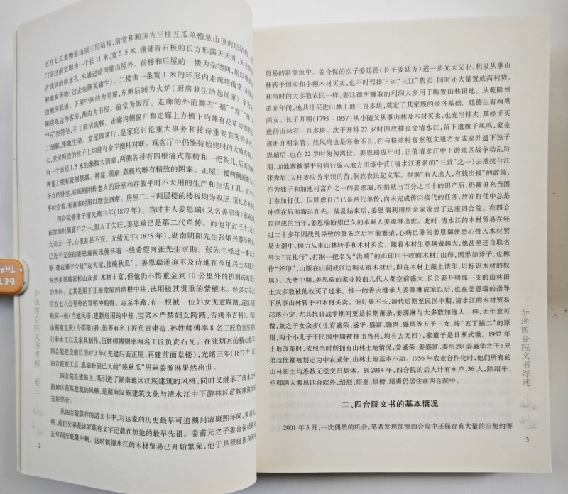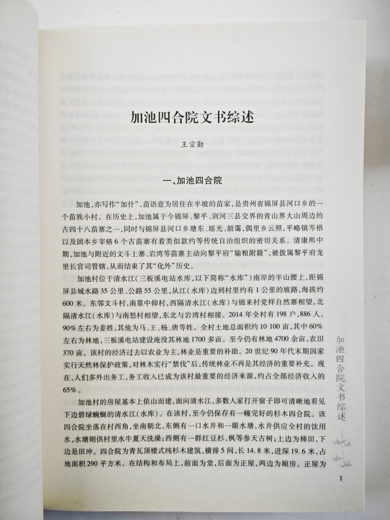 《加池四合院文书考释》(四卷)是对贵州省锦屏县加池寨四合院姜绍烈家族所藏文书进行整理、影印、点校、注释,该文书群保存完好,计1200余份,上起清乾隆中期,下迄1950年代,时间跨度近两个世纪。其内容以林业经营为主,涉及山林土地买卖、租佃关系、宗法规则、赋役制度、司法诉讼、风土人情、宗教信仰等等。文书类别除一般散件契约外,还有三本有关林业经营的簿册文书,资料集中,纪录完整,研究价值很高。
