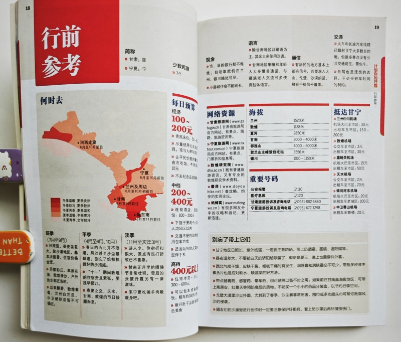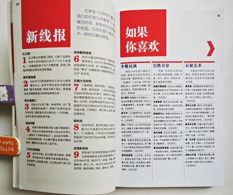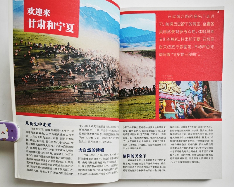 在丝绸之路的盛名下走进甘肃和宁夏,触摸历史留下的瑰宝,坐看各类自然景观争奇斗艳,体验异族文化的精彩。无论是河西走廊的丝路古韵,还是甘南的遗世独立,抑或是真主护佑下的宁夏,这片土地体现的都是大自然的粗犷之美,即便游牧生活早已远去,边塞诗里的不羁浪漫却留了下来。沙漠、雅丹、丹霞、草原、冰川在狭长的河西走廊上次第展开;南边的祁连山巍峨凛然,山丹军马场上神驹驰骋。月牙泉依偎在鸣沙山怀中,莫高窟率领着麦积山石窟等众家族成员向历史致敬。甘肃和宁夏在纷至沓来的旅行者面前,不动声色地谱写着“文史地三部曲”。