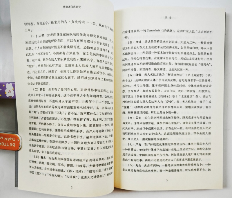 他之研究宗教学,我想,其用心大概与研究扶箕的迷信是一样的罢。在他近著《扶箕迷信底研究》一书中,我们惊叹于他考证之功,也心折于他的论断之正确,他是为了要证明扶箕是一种自觉的或不自觉的骗术,乃就其有关的各方面,详加考证。……他这研究方法完全是科学的!——茅盾