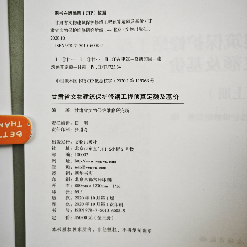 《甘肃省文物建筑保护修缮工程预算定额及基价》共分12章以及附录,含4822个子目,分上、中、下三册,涵盖了文物建筑保护修缮工程中的土石方及基础加固工程、石作工程、砌体工程、地面工程、屋面工程、抹灰工程、木构架及木基层工程、斗拱工程、木装修工程、油饰彩绘工程、材料运输、措施项目等内容,附录还明确了工程费用定额、灰浆配合比和北方地区青瓦、青砖常见规格尺寸、定额等内容。该项定额基价体现了“科学合理、反映实际、规则明晰、贴近市场、操作性强、体现甘肃特色、满足计价需要”的原则,突出反映了甘肃地方文物建筑特点和甘肃社会消耗量水平,为规范实施全省文物建筑保护修缮工程提供了依据和指导,施行后将进一步提升全省文物建筑保护修缮工程科学化、标准化、规范化水平。