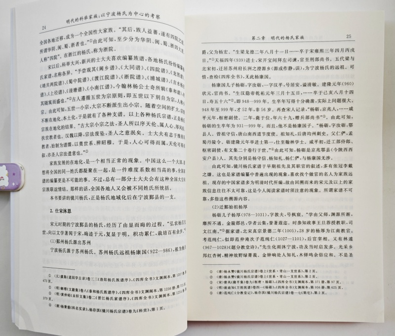 笔者对以宁波杨氏为中心的明代科举家族个案史设计了纵横两个路径,一是历史的嬗变,谈宋元明时期的杨氏家族兴衰历史及家族特色。二是横向的论述,分别论述家族的维持、家族与地方关系、学术与诗文成就。重点谈宁波镜川杨氏科举家族的嬗变历程及其学术贡献,逻辑结构十分清楚,体现了家族与学术两条主线。这也正结合了笔者的两大强项,一是浙东学术研究,二是明代科举研究,是两个研究方向的交接点所在。这是根据笔者的学术背景建构出来的科举家族研究模式。